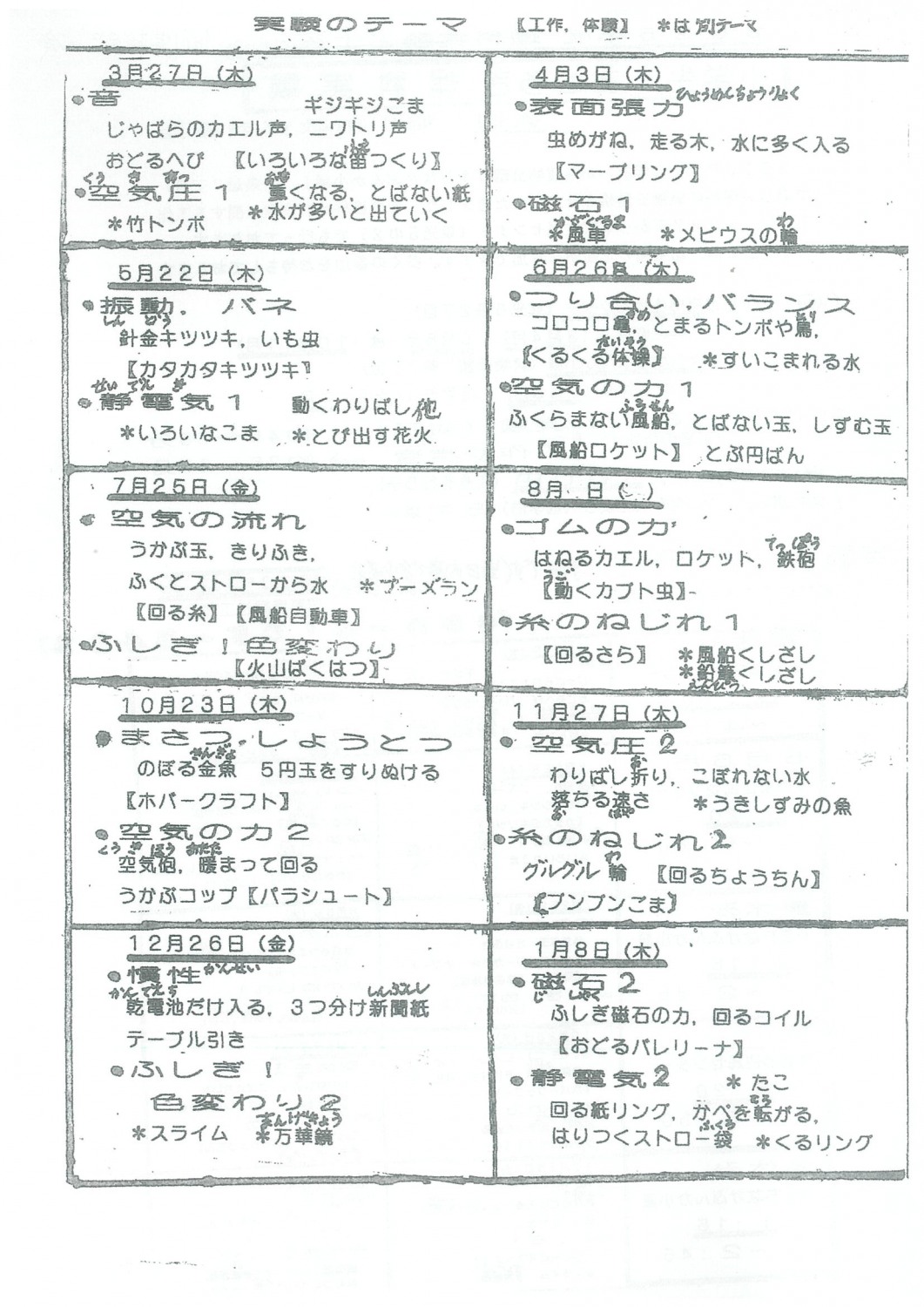 ②6月25日(木)・空気圧(とばない紙、おれるわりばし、こぼれないコップの水、竹とんぼ、水が流れてとまる)・つり合い・バランス(コロコロかめ、とまるトンボ、鳥クルクル体操)・すいこまれる水・スライム