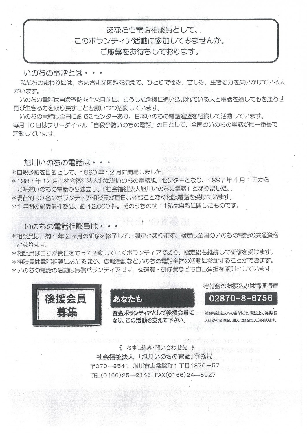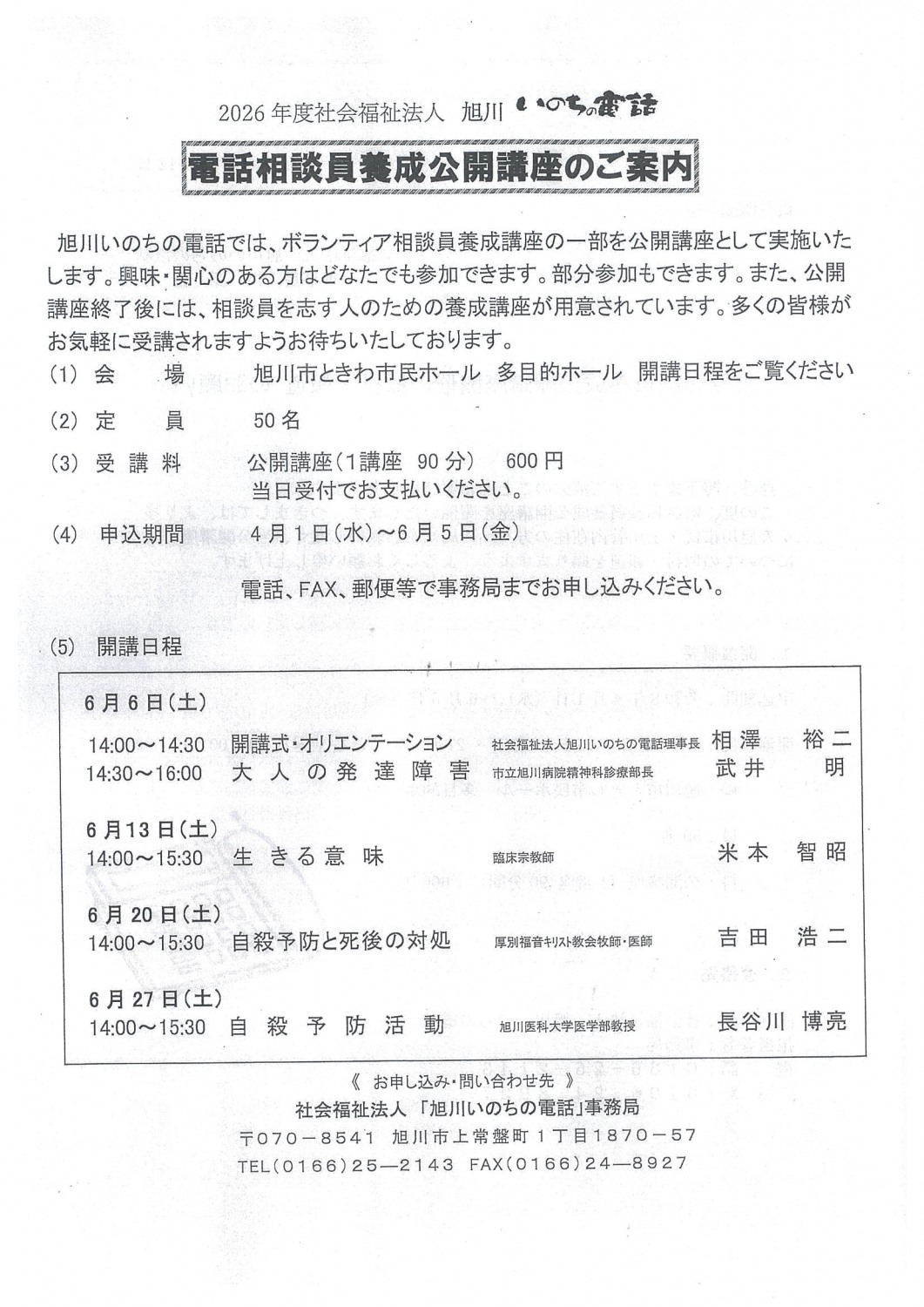 旭川いのちの電話では、ボランティア相談員養成講座の一部を公開講座として実施いたします。興味のある方はどなたでも参加できます。部分参加もできます。また、公開講座終了後には相談員を志す人のための養成講座が用意されています。