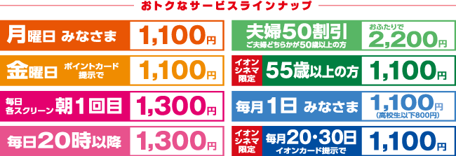 割引設定は、通常1,800円のところ、毎週月曜日は1,100円、金曜日はポイントカード提示で1,100円、毎月1日は1,100円、毎月20日と30日はイオンカード提示で1,100円となる。モーニングショーは、毎日各スクリーンの1回目の上映が1,300円。レイトショーは、毎日午後8時以降の上映がすべて1,300円になる。シルバー割引は、夫婦どちらかが50歳以上だと2人で2,200円。55歳以上の人は1,100円になる。※3D作品は上記料金にプラス300円と、3Dメガネ代100円が別途必要。