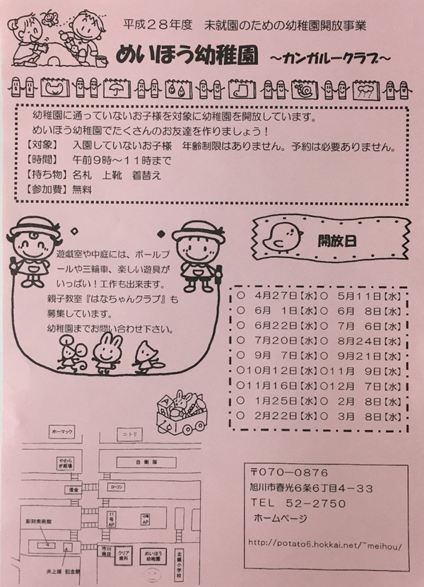 ▶大きなサイズで見る こちらも一般開放の「カンガルークラブ」を年間18回の水曜日で開催。遊戯場や中庭で遊具をつかって遊んだり、保育室で工作したりします。 親子教室「はなちゃんクラブ」もあるそうです。チラシはざっくりしていますが、ホームページに内容が書かれています。 めいほう幼稚園 旭川市春光6条6丁目