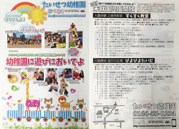 実は、私のこどもが今年幼稚園に入園したのですが、入園前に開放事業は一度も活用しませんでした。ほかの子が入園式当日にすでに幼稚園に溶け込んでいたり、お母さん同士が仲良くなっていたりする様子を目の当たりにし、開放事業のメリットを今さらながら痛感しているところです。これから入園を控えているご家族は、ぜひ参加してみたら良いと思います。 今後も、ライナーへの掲載や折込があれば随時追加していきますね。
