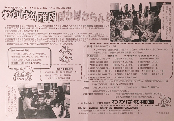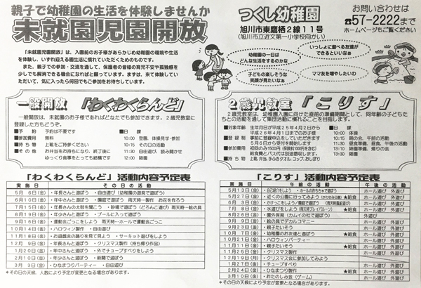 旭川市内の各幼稚園では、未就園児を対象にした開放事業を行っています。 2016年春、ライナーに各園のチラシが折り込みされました。対象年齢や予約方法、日程などがわかりやすいので、まとめてみました。