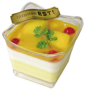 マンゴームースにほんのり甘いココナッツミルクゼリー、濃厚なマンゴーソースと果肉を重ねて。甘酸っぱいグロゼイユ(赤すぐり)がアクセ ント。夏期限定。