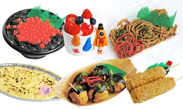 見た目そっくりのたこやきシュー、いちごゼリーのいくらとクレープで作った海苔がリアルないくら丼の中身はフルーツが入ったショートケーキ。いちごミルフィーユの上にパルメザンチーズをのせたグラタンミルフィーユ、串かつ、焼きそばなど、今年も気合十二分の商品がショーケースに並びます。
