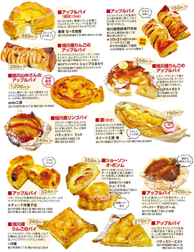 旭川の果樹農家さんとお菓子屋さんが力を合わせ、旭川産のりんごを使ったパイやタルトを期間限定、数量限定で販売します。この時期ならではのお楽しみを味わってみませんか。販売期間は、10/29(土)〜11/6(日)。各店舗でお買い求め頂けます。旭川調理師専門学校は、10/31(月)のみの販売になります。また、営業日や販売時間も各店舗によって異なりますのでご注意ください。