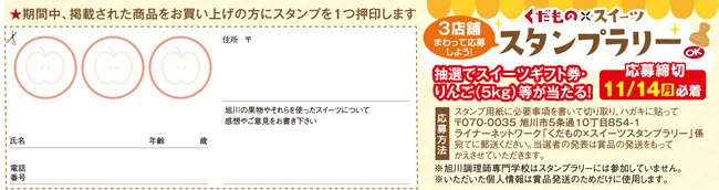 期間中は、スタンプラリーも開催!応募者の中から抽選でスイーツギフト券やりんご5Kg等が当たります。3店舗をまわってご応募ください!※旭川調理師専門学校はスタンプラリーには参加していません。