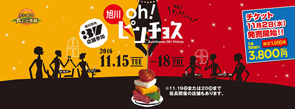 串料理(ピンチョス)とワンドリンクでハシゴ酒を楽しむ「旭川oh!ピンチョス」が今年も11月15日(火)から18日(金)まで(一部店舗は19・20日まで)、旭川市中心部をはじめとした飲食店で開かれます。市民有志でつくる食の応援団、たいせつ食の元気隊の主催。
