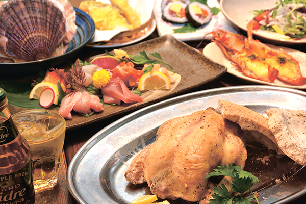 香草たっぷりの塩釜で1時間焼き上げた丸鶏がメイン。塩の塊からごろっと現れる、ほろほろで肉汁たっぷりの鶏肉はビールにも焼酎にも相性抜群です!創作料理が得意なこともあり、コース内容を気軽に相談できるのも魅力です。