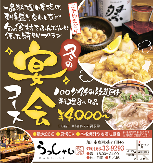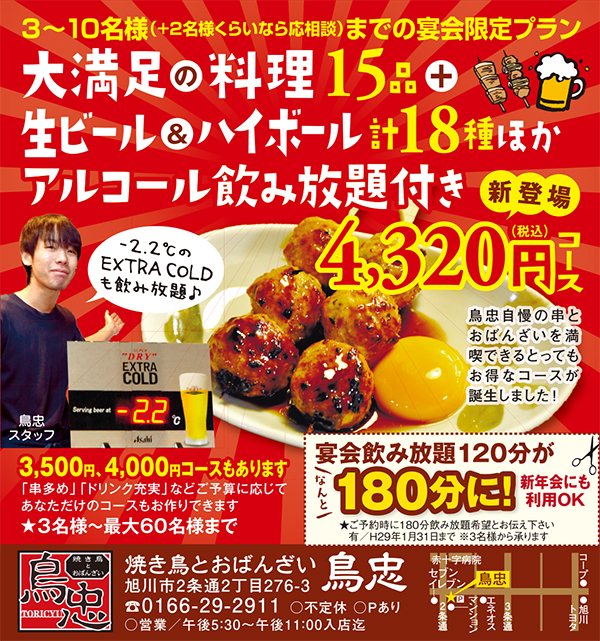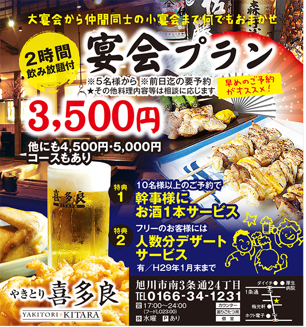 11/28(月)~12/8(木)の宴会限定予約時ライナー見たよで4,500円コースが4,000円、5,000円以上のコースは一人500円引!