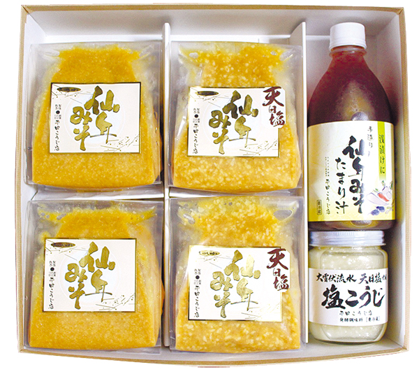 【詰め合わせギフト】4,000円(税込) /こしみそ500g×2、 天日塩味噌500g×2、たまり汁500ml、塩糀(要予約)