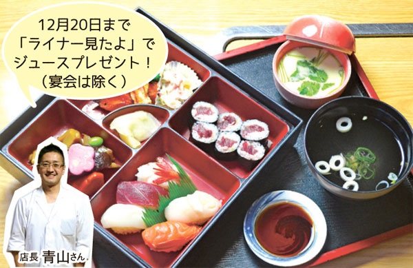手頃な価格で贅沢な食事を楽しめる寿司弁当(1,500円)は女性に大人気。宴会では新鮮な寿司ネタはもちろん、つくね鍋やザンギなど全6品4,000円のコースも受付しています(前日まで要予約)。