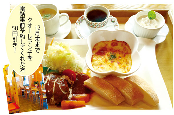 今月からの新メニュー「クオーレランチ」は、煮込みハンバーグ、熱々のグラタン、サラダ、パン、スープ、コーヒー、日替わりデザートが付いて1,350円(税込)。同店の人気メニューを惜しみなく集めた贅沢なプレートです。