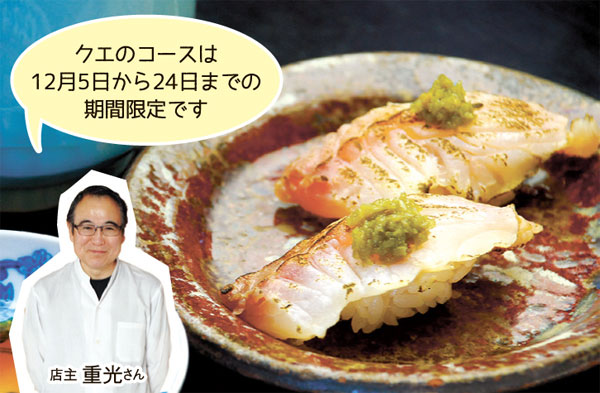 希少な海の宝石「クエ」を鍋、握り、ヒレ酒などのコース料理で