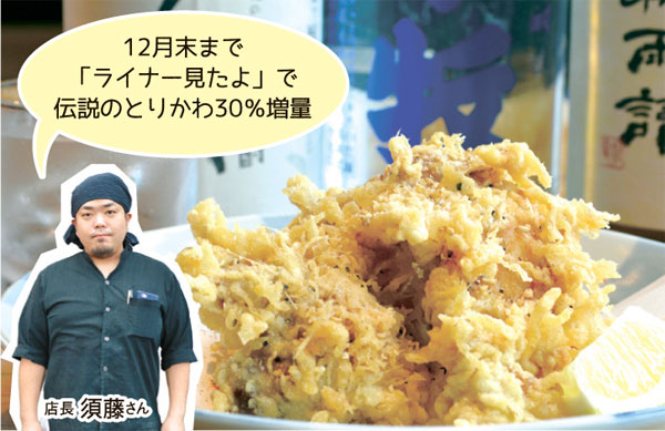 伝説のとりかわや特製ザンギ(680円)をはじめ、鶏料理が人気。宴会は90分飲み放題付きで3,500円から。ランチでは上川産大雪蕎麦を提供しており、年越し蕎麦(1人前550円)の予約も受付中です。