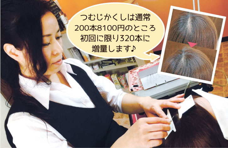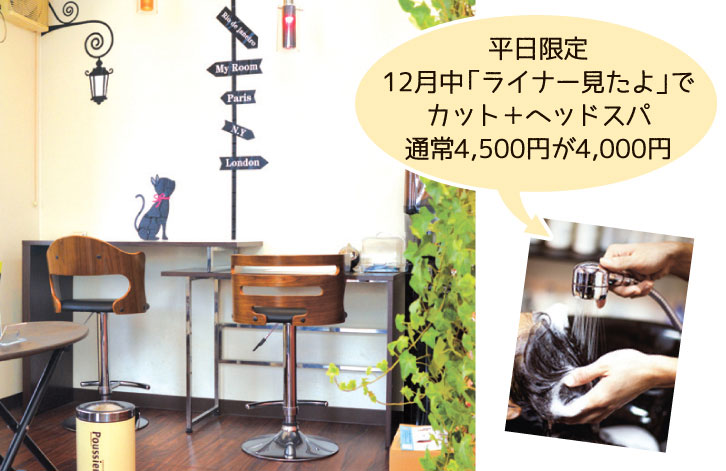 スタイリスト1人、ベッド1台の隠れ家のような美容室。地毛に人工毛髪を結ぶ人気の施術「つむじかくし」は、髪の毛にハリやコシを作り、ボリュームアップにも効果的。民間自然療法で行うヘッドスパも好評です。