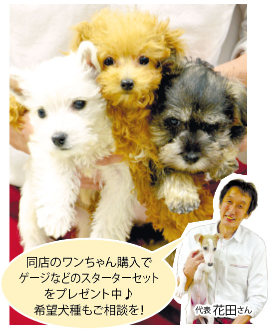 店舗としての看板はありませんが、犬舎を持つブリーダー歴25年の花田さんが自家繁殖したワンちゃんをペットランドフィール店内で販売しています。12月末までは、チワックスなどのワンちゃん5万円セールも実施中!