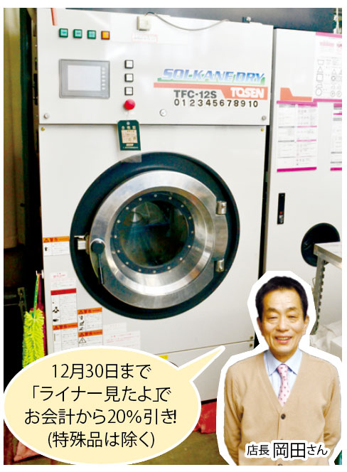 同店では、より衣服に負担をかけず低温で乾燥させる「ソルカンドライ機」を使用。生地を傷めず、溶剤の匂いが残らない為、肌や衣服に優しい仕上がりが好評です。「9」のつく日は定価より20%オフ!※特殊品は除く