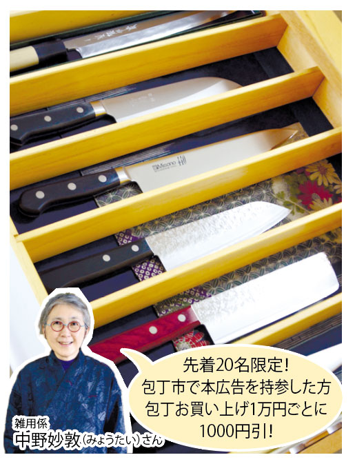 工業用刃物の設計・製作や、家庭用包丁の販売と研ぎをおこなう同店では、12月10日から24日まで、包丁市を開催します。10日、17日、24日の10時から13時までは、代表で研ぎ師の中野由唱さんによる包丁研ぎの実演も!