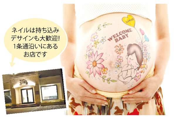 高い提案力、浮きにくさが自慢のネイルサロン!妊娠中のお腹に描くマタニティアートも人気で、旭川で出来るのは同店だけ。プロのカメラマンによる家族写真とペイントアップの写真付きで10,800円(税込)。