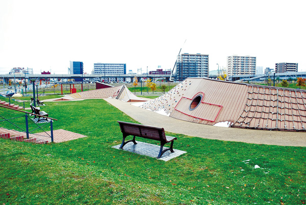 ④ボルダリングやジャングルジムなど6~12歳向けのちょっとハイレベルな遊具がそろう宮前公園。夏場は花と緑で美しく、2つある噴水の周りでは子供たちが元気に大はしゃぎしています。犬の散歩や眺めを楽しみながら散策する住人の憩いの場所でもあります/宮前公園