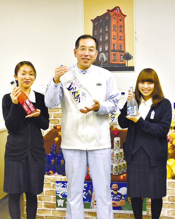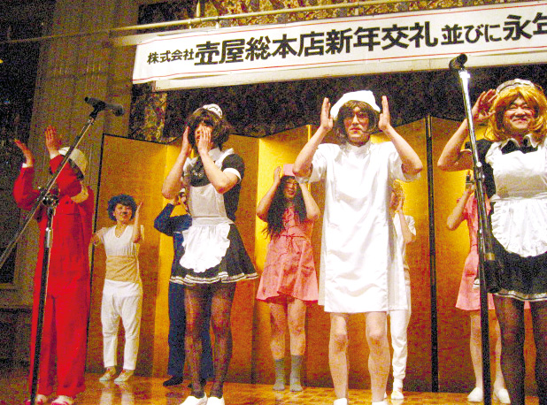 ⑥壷屋といえば、いわずと知れた老舗菓子店。スタッフもさぞや伝統を重んじて粛々と…と思いきや、写真は毎年恒例新年会のご様子。はじけてますっ!クリスマス、年末年始商戦を控え超多忙なこの時期、実は上司陣の頭の中は女装かくし芸やラッピングのチームリレーなど分刻みの台本作りでいっぱい・・・。営業課長の木村竜二さんは、もはや女装慣れしてセルフメイクも完璧。「意外なスキルが伸びたよねー」。この企画力と実行力、すべてが店のイベント作りに直結しているんだろうなぁ/壷屋 き花の杜☎0166-39-1600