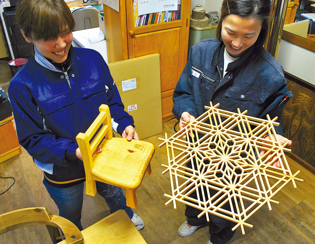 ⑧オーダー家具と建具を製造するオークラは創業60余年。「この辺りは準工業地域で、10軒ほど建具屋が軒を連ねていたけど、今はうちぐらいかなぁ」と現社長が話すように、もともとは建具一本のオークラ建具でした。社長の姪っ子・川上姉妹が持つのは「じいちゃん(初代)にリクエストして作ってもらった組子」。姉妹は現在、釘を使わず木製パーツを組み上げる組子の技術を受け継ぎ、新商品の試作や姉は子供のための木工品をつくるブランド「コド木工」の職人としても活動しています/株式会社オークラ☎0166-31-9735