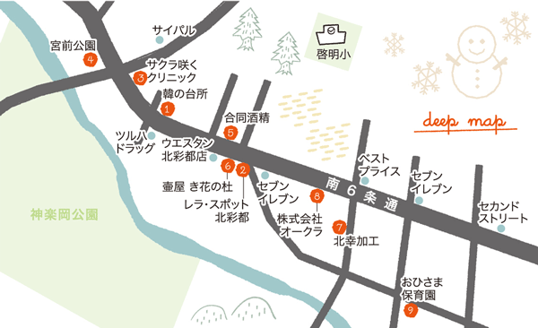 ①手造りキムチが人気。もともと中心部で韓国の調味料を販売していましたが、5年前の移転をきっかけに飲食スペースも登場しました。一番人気は海鮮スンドゥブ。純韓国人の金道子さんと息子さん親子が切り盛りしていますが、どちらも日本語ぺらぺら(息子さんは大阪弁も駆使)なのでご安心を/韓の台所☎0166-38-0889