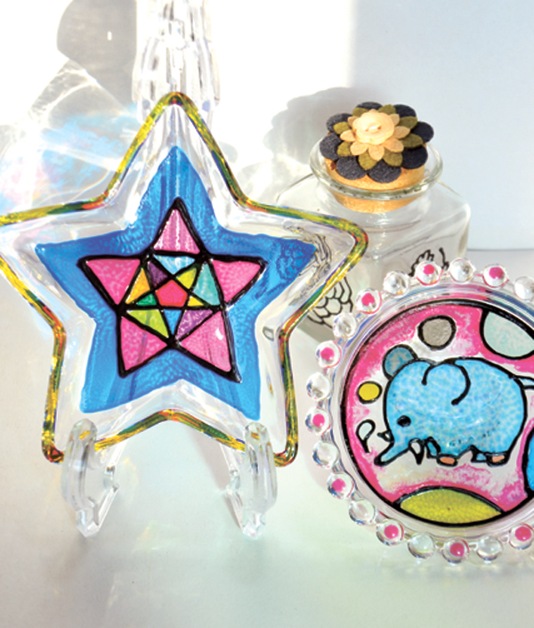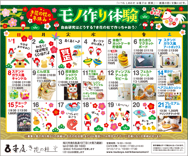 ステンドグラス風アート体験教室は、ガラス皿等に描かれた絵を選び、好きな色を塗って完成させます。12月23日(金祝)~1月15日(日)で2日前までに要予約。神楽岡店は日水金曜、末広店は火木土曜で、時間は午後から。(各日定員4名)参加費は2個選べて1,200円。