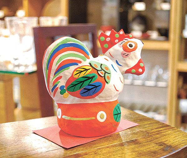 梅鳳堂には、伝統の技で作られた全国各地の置物が揃います。昔ながらの製法を取り入れた宮島張り子のニワトリは、くっきりと塗り分けられた色が大胆。「ハデ過ぎるようにも見えますが、色合いも模様も美しく素敵です」とスタッフの高橋さん。