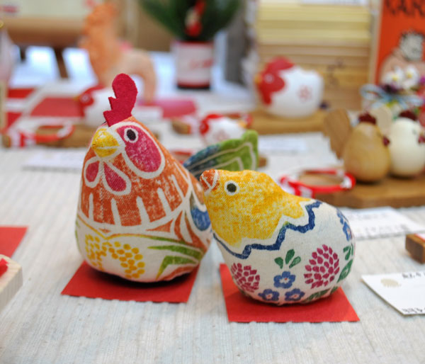 - 梅鳳堂 木版手染めの干支ぬいぐるみ 酉税込1404円、ひよこ税込1188円
