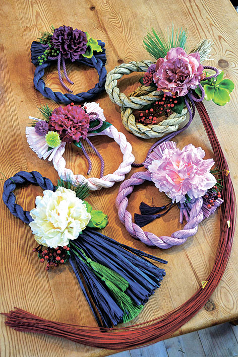 一方、ガーデンデザイナーmiuの高橋ひとみさんが作るしめ飾りは、ピンクや薄むらさき、ネイビーなどカラフルなしめ縄を輪に結んだ愛らしいリースタイプ。花の専門家らしく、ブーケのように様々な花を組み合わせ、空間を明るく演出します。