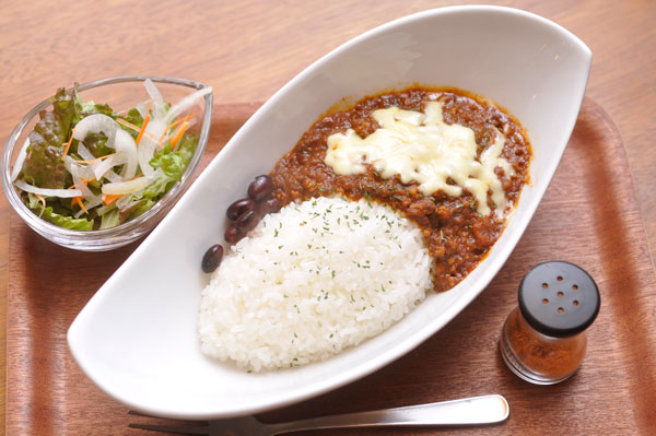 ランチにオススメなのは、独自ブレンドのスパイスに飴色の玉ねぎと小豆の甘さを加えた特製のキーマカレー。サラダ付きで、辛さは4段階、トッピングもあるので自分好みにアレンジできます。