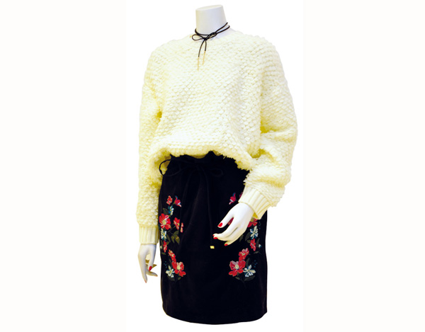 刺繍を施したタイトスカートはボリューミィなトップスと