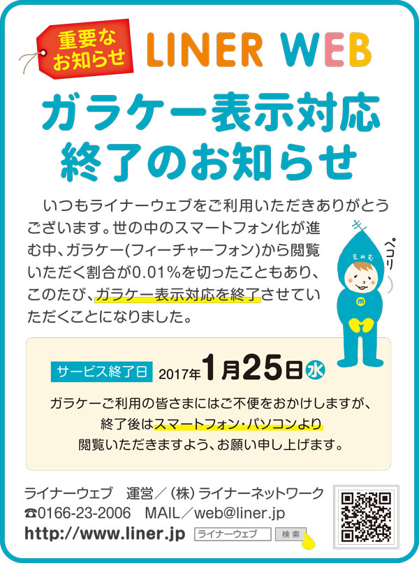ガラケーをご利用の皆さまにはご不便をおかけしますが、 終了後はスマートフォン・パソコンより閲覧いただきますよう、お願い申し上げます。
