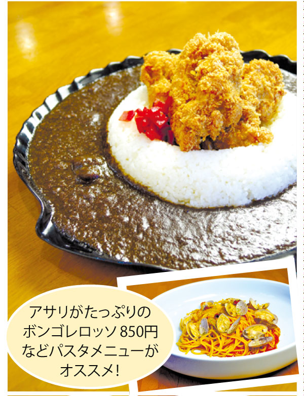 食事メニューが充実している同店で、一番の人気がチキンカツカレー。玉葱をじっくりと炒めて仕込んだ黒いカレーは辛口で、サクッと揚がったモモ肉の旨みがじゅわっと広がります。