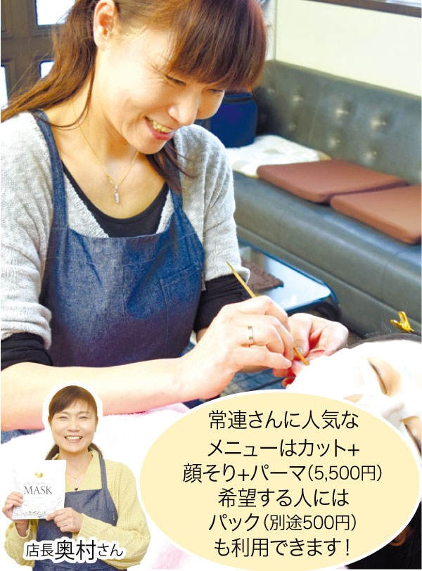 男性客が多い理容室のイメージを変え、女性も気軽に通えるようにと、ヘア以外に顔そり、美白パック等のメニューを取り入れました。