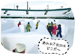 冬のスタルヒン球場恒例のちびっこスキー場には、雪の迷路が設置されています。縦25m、横12・5mの長方形で、壁の高さは1mほど。幼児がちょうど隠れるくらいです。「スタッフ17人、2日がかりの力作です。今年も楽しんで!チューブ滑りもオープンしていますよ」と担当者。旭川冬まつり期間中と2月14日(火)は午後7時まで営業します。昼間とは違う表情でさらに冒険心をくすぐります。入場無料。