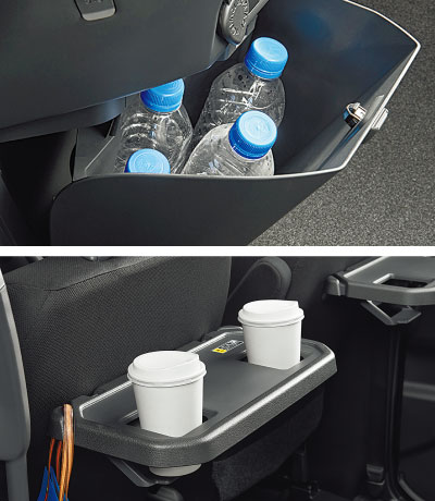 脱着可能な大型ダストボックスは、500mlのペットボトルもらくらく入る深さで、抜群の収納力。折りたたみ式のシートバックテーブルや、センターフロアトレイ、靴が収納できるシートアンダートレイなどもあり、収納スペースは全部で10カ所以上と充実。空間を散らかさずキレイに保つ工夫が施されています。