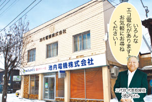 昭和25年創業の、町のでんき屋さん。「省エネルギー効果が高いエコ電化をおすすめしています」と話す池内さん自身も、暖房機器は近年選ばれているエアコン派です。省エネに興味がある方は相談してみては?