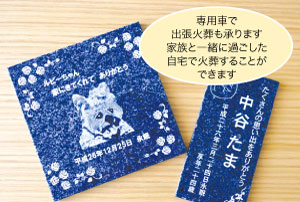 あらゆるペットの火葬と葬儀を執り行っています。昨年、当麻町の円明寺にペット専用の合祀墓も建設しました。合祀墓にはペット銘板式墓碑(写真)も設置できます。料金は2万円から。