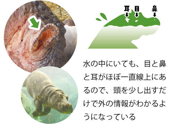 水の中で動くことが多いので、耳の中に水が入らないように弁がついている。耳が自在に動くので万が一水が入っても、くるくると回して水を飛ばす。