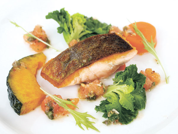 アラカルトのほか、コースは3000円(税抜)から。写真の「旭川産仔豚の炭火焼き」は、ソースに頼らず、肉そのものの旨みを生かした清廉な一皿。「生産者と僕らはチーム。旭川界隈を皿の上で表現したい」と話すように、野菜もすべて近郊産です。ぜひ、スパイシーな風味の「レ・クローズ・ド・クロワゼ・バージュ2006」を合わせてみて。様々なワインを試したい人は、シャンパン、白、赤が1杯ずつ愉しめるペアリングプラン(2000円・税抜)がおすすめです。