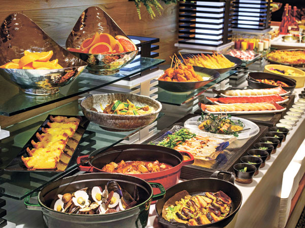 寿司、天ぷらはもちろん、メイプルシロップのほろ苦ソースで仕上げるチキンソテーなど、ライブキッチンで作りたてを味わえるのが醍醐味。契約農家のとれたて野菜をはじめ、上川産ほしのゆめと男山の酒粕を使ったリゾットなど、北海道の恵みがふんだんに並びます。スイーツも春らしいメニューでボリュームアップ。