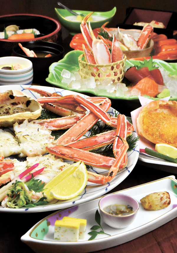 縁起をかついだ「花咲会席(一人前4300円)」は、造り、揚げ、焼きとカニの旨味を存分に堪能できる盛りだくさんの内容です。もう少し花を添えたいなら、ずわいの姿焼き(時価6000~9000円=写真左=)がおすすめ。カニでお腹いっぱい…なんて贅沢な夢が叶いそうです。そのほか、会席は一人2000円から、ゴージャスな「かにすき会席(一人前8500円)」などもあり、予算に合わせて選べます。