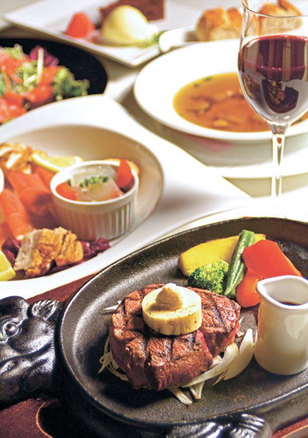 マチナカで洋食と本格ステーキが味わえるリストランテカーヴは、老舗・石焼料理菊善の姉妹店です。上質なメニューを利用しやすい価格で提供しようと、〝高級感があるけれど高すぎない〟カジュアルフレンチをテーマにしています。
