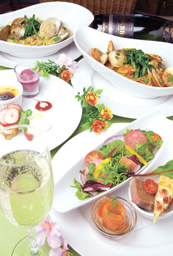 卒業や入学、ちょっとしたお祝いにおすすめの「卒業・入学おめでとうプレート3」は、旬の野菜を使ったサラダやキッシュなどの前菜に、白・赤2種の味わいが選べるハマグリやアサリを使った春パスタ、フルーツたっぷりのケーキやジェラートが乗ったデザートの3つのプレートで2000円。サービスのノンアルコールシャンパンで乾杯しながら、特別なひとときを楽しんで。