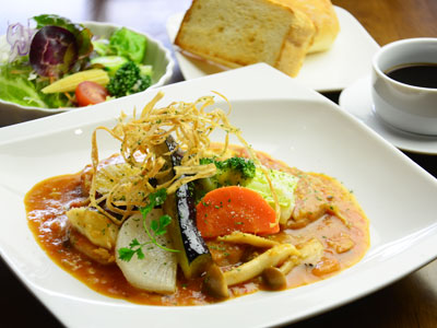 ランチセットは8種類あり、中でもおすすめは「四元豚ヒレ肉のトマト煮込み」。舞茸やマッシュルームなど4種類のきのこを加えた深みのあるトマトソースで煮込んだヒレ肉はとっても柔らか。噛むほどに豚肉の上品な甘みが広がります。ナスや南瓜、サツマイモなどの8種の素揚げ野菜は素材の甘みと食感を楽しんで。パルメザンチーズでまろやかに仕上げたソースはヘルシーで、最後の一口まであっさりといただけます。