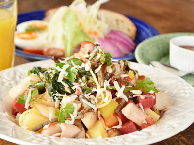 農家さんから“直買い”した野菜は、作った人らしさが滲み出るなんとも素直で贅沢な味です。そんな野菜たちがてんこもりになったパスタは、運ばれてきた姿に圧倒される大ボリューム!ここにはぜったいおなかぺっこぺこにして行ってね。