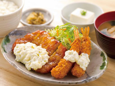 今回ピックアップしたのは、チキン南蛮とエビフライの定食。甘辛いタレをまとったチキン南蛮とサクサクの衣が自慢のエビフライに、自分でかきまぜてつくるタルタルソースをたっぷりかけていただきます。マヨネーズと卵黄のまろやかさがマッチした具だくさんのタルタルソースはご飯との相性も抜群。ごはんはおかわり無料です。おかわりはできませんが、より健康を意識したい人には十六穀米に変更することもできます。