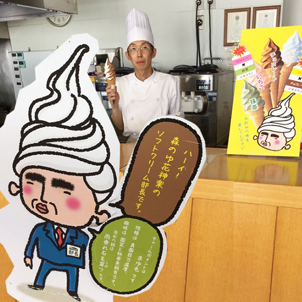 東神楽の温浴施設・森のゆ花神楽の100円ソフトをPRするため誕生したソフトクリーム部長。温厚でまじめ、趣味は演芸と熱帯魚飼育。座右の銘は「雨垂れ石を穿つ(どんなに小さな力でも、根気よく続けていればいつか成果が得られることの例え)」。前支配人自らデザイした力作です。/森のゆ花神楽